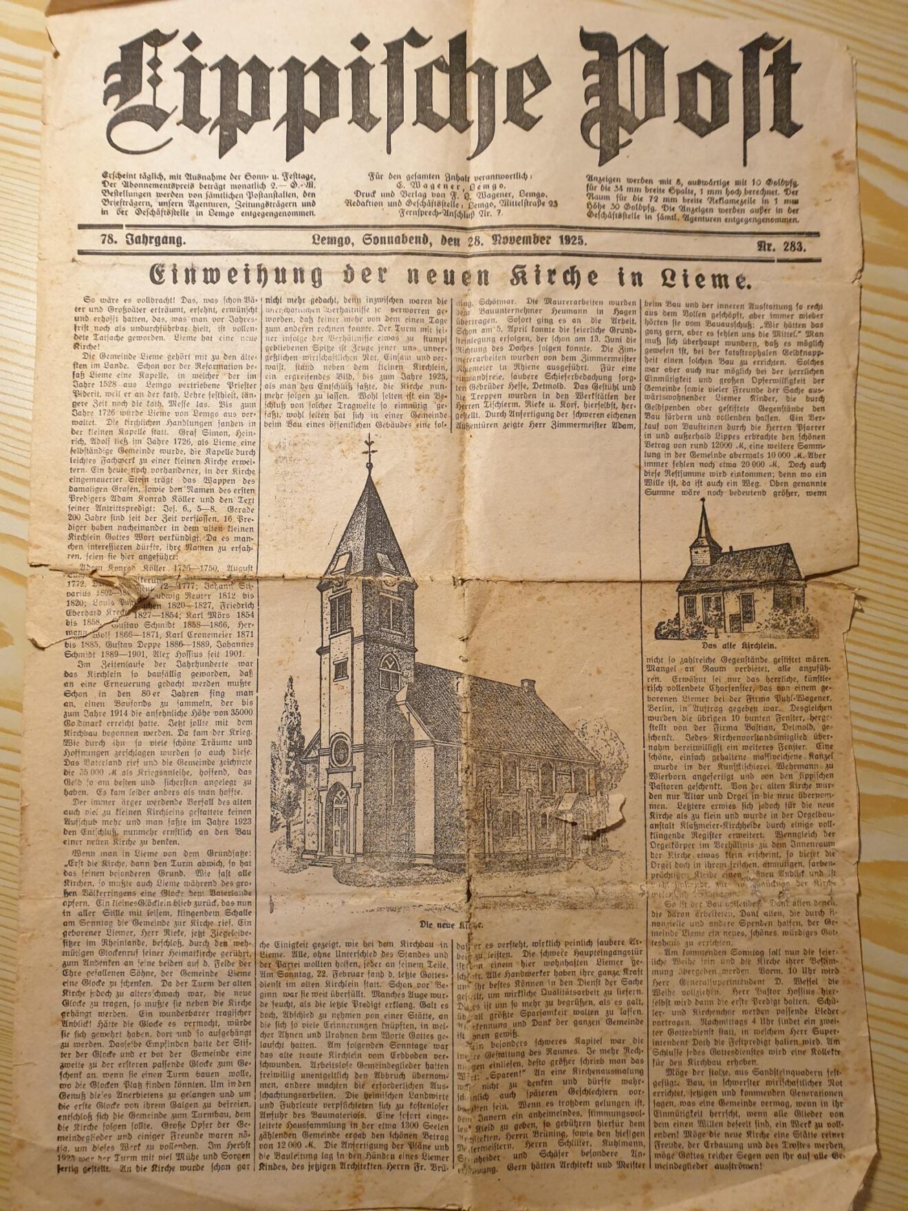 In einem Haus in Lieme wurde nebenstehender Zeitungsartikel der Lippischen Post vom 28.11.1925 gefunden, der auf die Einweihung der Kirche hinweist und die Entstehungs-geschichte des Gebäudes beschreibt.