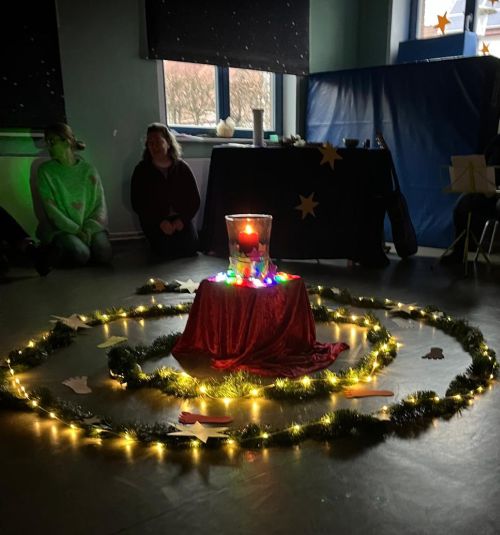 Es ist 9.30 Uhr am Dienstag und am Mittwoch. In der dunklen Turnhalle liegt die Adventsspirale in der Mitte auf dem Boden. An ihrem Ende leuchtet das Licht einer Kerze. Alle Kinder sitzen in einem großen Kreis um die Spirale herum.