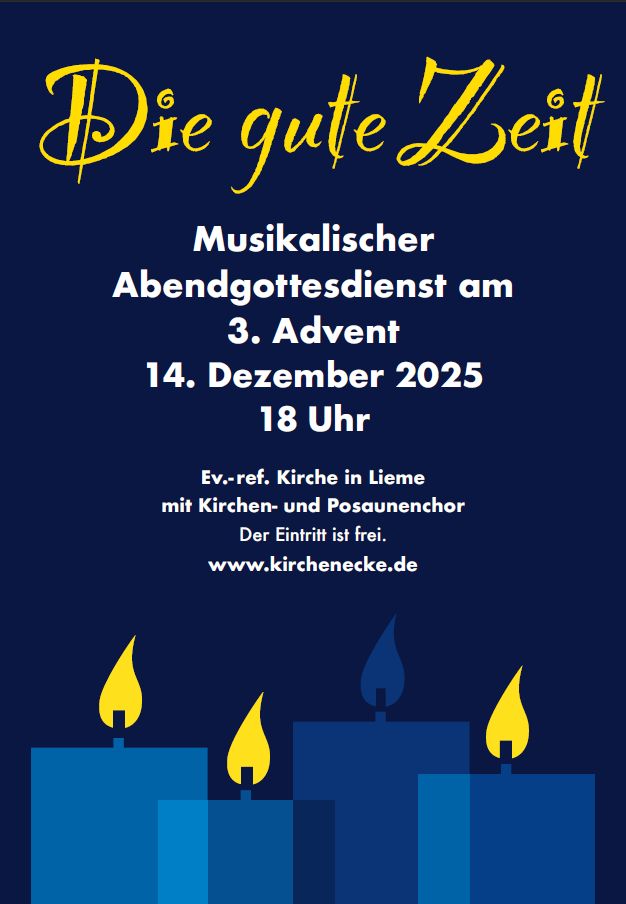 DIE GUTE ZEIT werden wir miteinander haben, wenn am 3. Advent (14. Dezember) in unserer Kirche festliche adventliche Musik dort aufgeführt wird. Der Posaunen- und Kirchenchor laden wieder ein, auf die besonderen Klänge zu hören und mitzusingen.